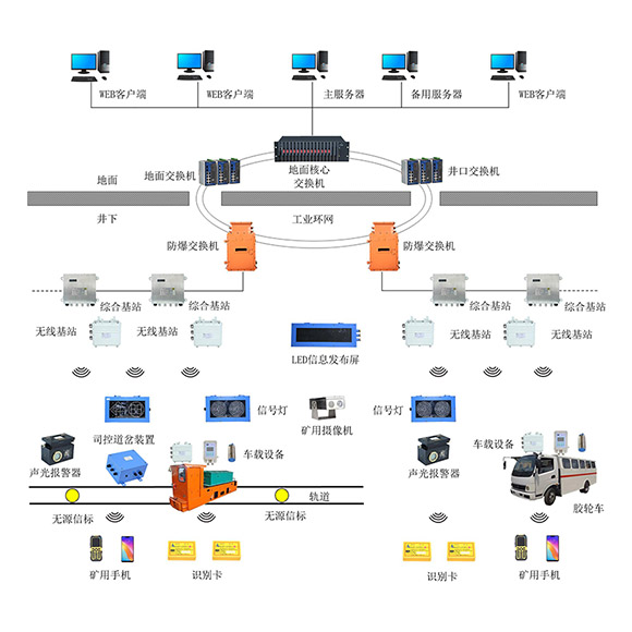 煤礦無軌膠輪車運輸管理系統(tǒng)是保障井下行車安全、提高運輸效率和運營管理水平的重要設施。為確保行車安全,系統(tǒng)設有岔口語音提示功能,岔路口時語音提示“車輛通過,請行人注意”;系統(tǒng)設有防碰撞報警功能,兩車距離較近時,系統(tǒng)會提示,前方或后方約多少米處有車輛,請司機注意;設有同步監(jiān)控功能,機車運行信息同步上傳調度室,可以同步監(jiān)控機車運行狀況,車輛調度系統(tǒng)通過優(yōu)化的閉鎖邏輯,控制井下交通燈,引導井下車輛有序運行,杜絕了車輛堵死、追尾等現象,很大程度地提高了運輸效率。