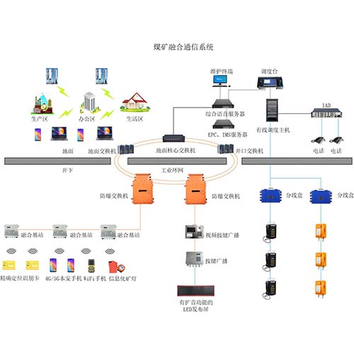 煤礦融合通信系統(tǒng)解決全部通信要求,各系統(tǒng)可并存服務控制系統(tǒng),互為備份,將語音、短信、傳真、無線集群、視頻、網絡等多種通信手段進行無縫鏈接,程控調度系統(tǒng)與地面電話、井下無線通信系統(tǒng)、應急廣播通信系統(tǒng)、監(jiān)測監(jiān)控系統(tǒng)、視頻監(jiān)控系統(tǒng)等系統(tǒng)多網融合,實現調度通信視頻聯(lián)動功能,實現了井下高速傳輸,4G/5G融合通話、應急廣播、井下人員精確定位等功能,進而助力智慧礦山建設。